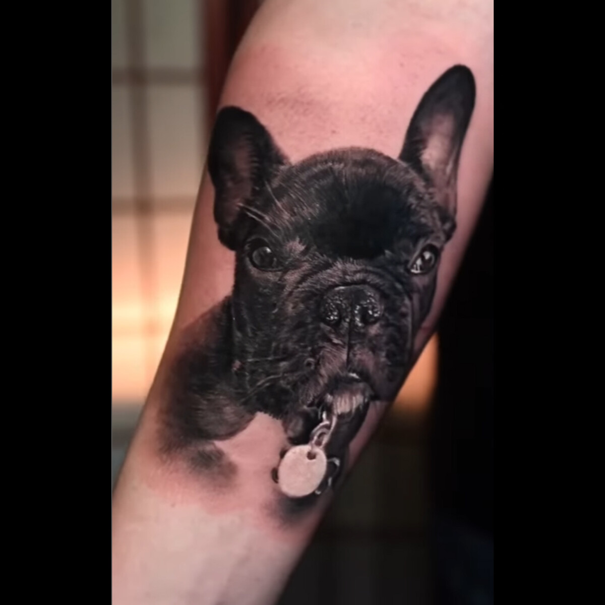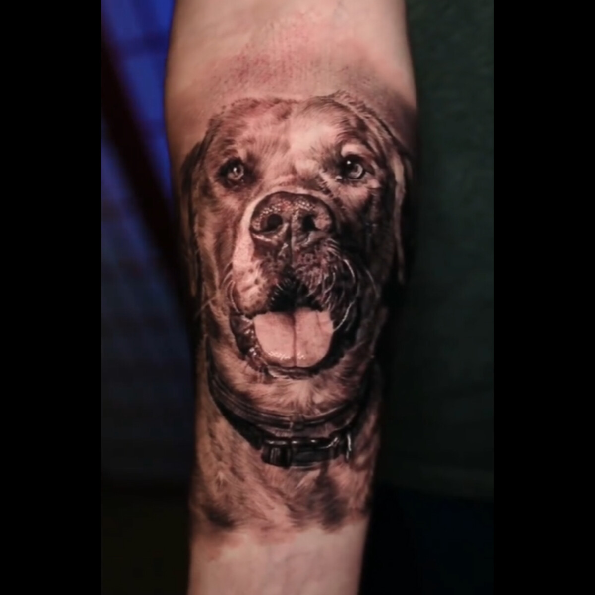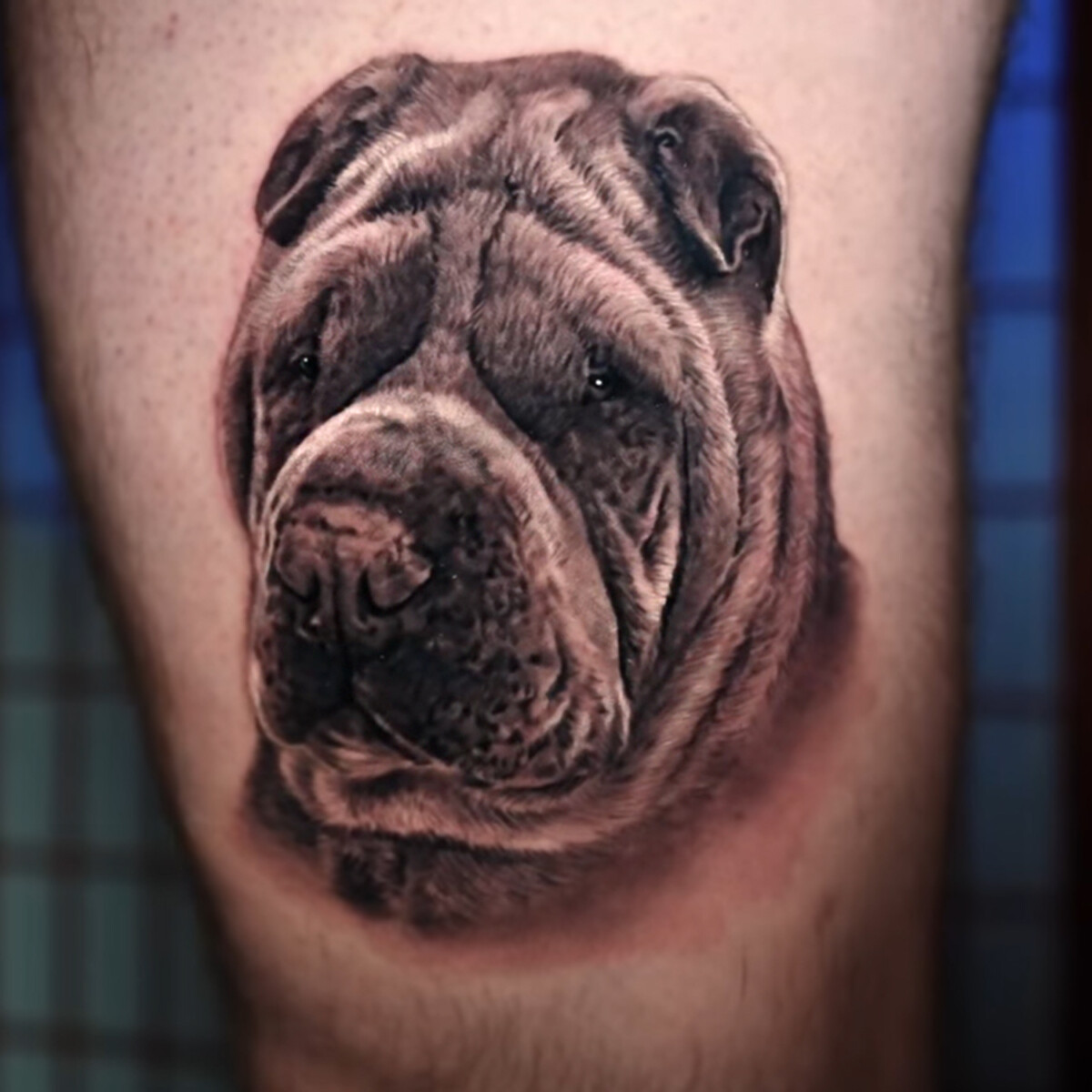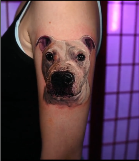 Placement of a portrait tattoo can also make or break how the tattoo appears. The contours of the body affect the appearance of the tattoo. If a portrait was placed on the ribs, for example, the tattoo would appear wobbly and likely alter the resemblance of the overall portrait. Therefore, large and flat areas work best for portrait tattoos. These areas will allow for the tattoo to appear the same regardless of the angle it is viewed at. Flat areas will also limit the distortion of the tattoo as you move around. The best location for a portrait tattoo is somewhat dependent on each individual’s frame. A large, flat area, such as the thigh, will allow the artist to go big enough to include all details which define a person or pet’s face.